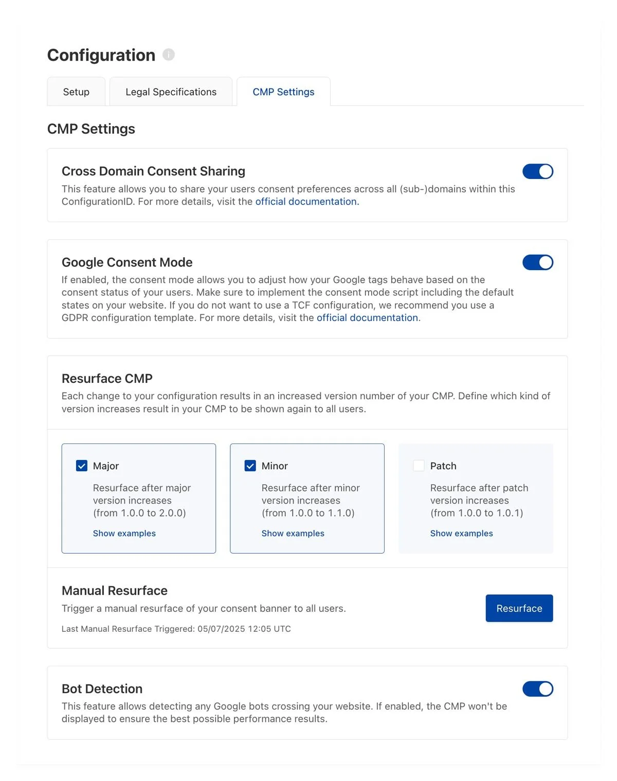 - Partage de consentement inter-domaines - Partager les consentements des utilisateurs entre plusieurs (sous)domaines pour offrir une expérience utilisateur fluide et réduire la fréquence d'affichage du bandeau.